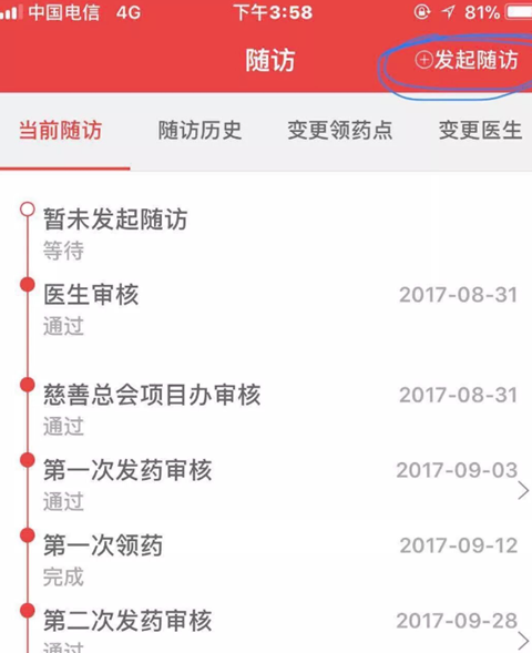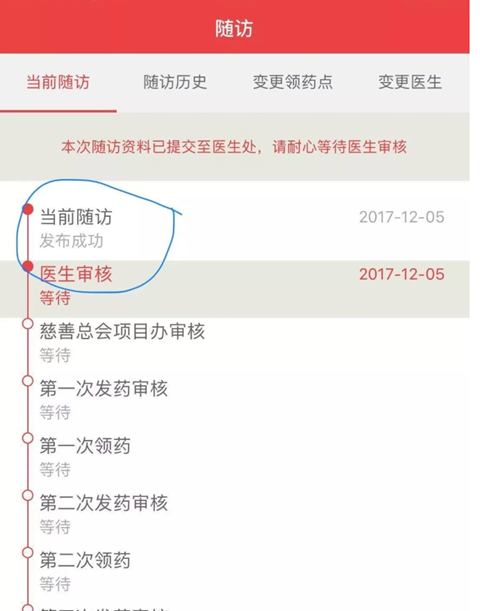 在随访界面查看当前随访状态,等待医生审核和慈善总会项目办审核,审核通过即随访成功。