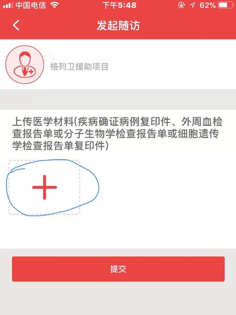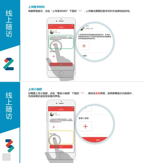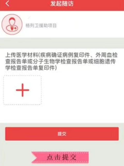 根据界面提示,点击“上传医学材料”下面的“+”,上传随访需要的医学材料并选择相应时间。