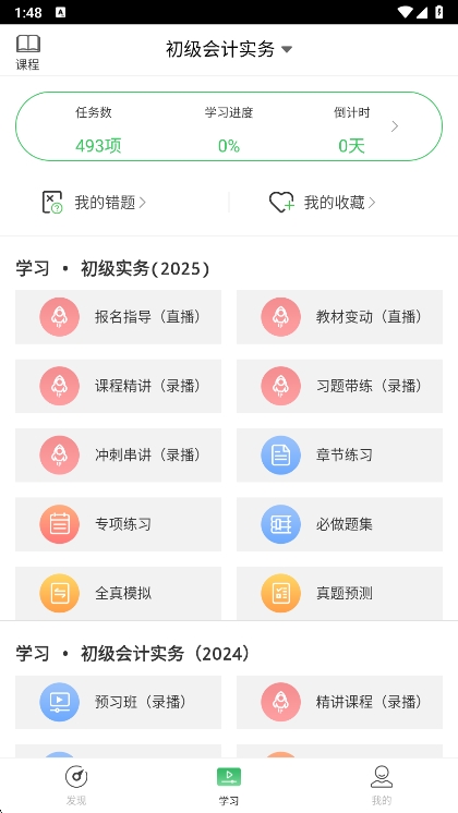浏览课程:登录后点击“发现”进入选课中心,查看套餐介绍(如初级会计、计算机等级考试等)。