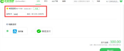 ③账号有K币(原平台中铜币)支付时将自动扣除剩余K币,再选择支付宝或微信支付,点击【确认支付】: