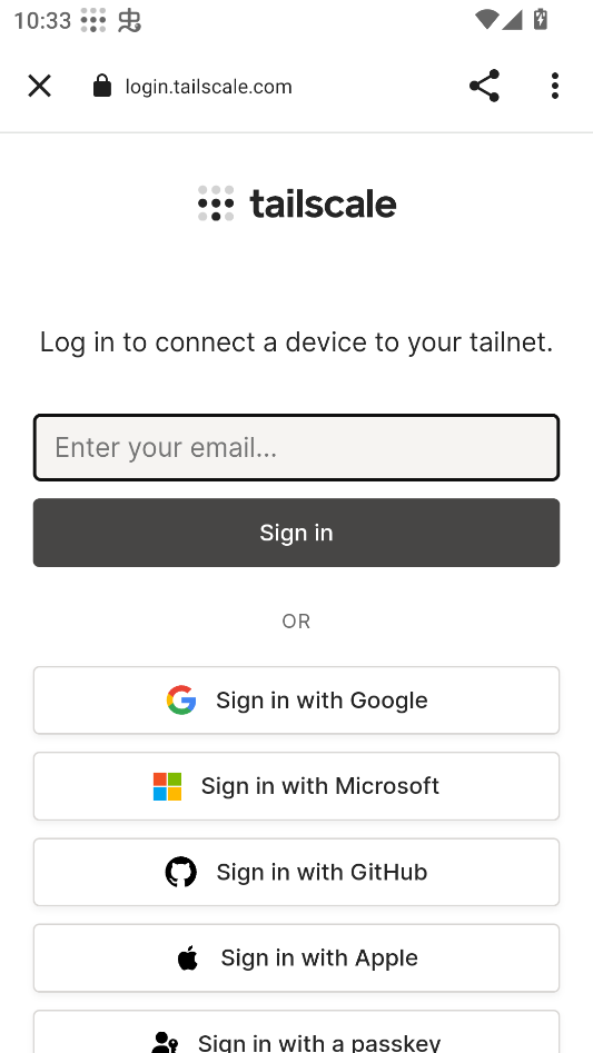 打开 Tailscale 客户端,使用邮箱或第三方账号(如 GitHub、Google)登录。