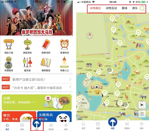 上野APP的首页展示就有地图,在地图上可以查到所有项目、动物展区、动物互动、剧场表演、餐饮、科普讲解以及纪念品店等,其实就是把纸质地图搬到了手机上,不用全程拿着一张地图到处走了。这个功能满足了游客的根本需求,电子地图在游玩时不仅使用方便,还随时能用,没有纸质地图携带不方便的麻烦,这个功能真的可以给个赞。
