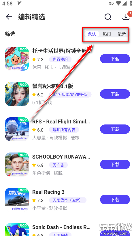 2.自由选择点击默认、热门、最新,就可以看到相对应板块的游戏。