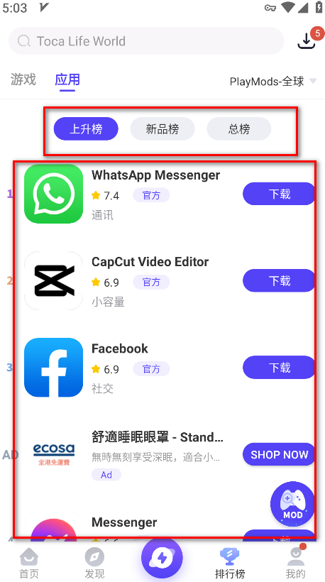8.我们可以选择上升榜、新品榜、总榜来找到我们想要的软件。
