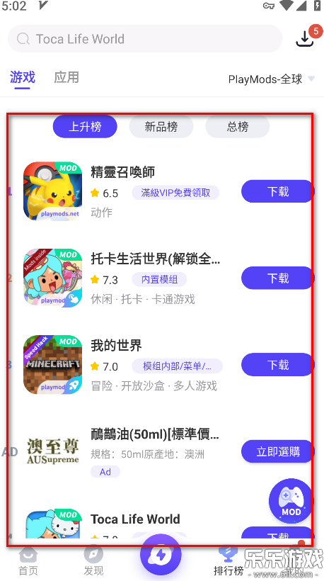6.会出现游戏板块内容,自主选择上升榜、新品榜、总榜找到我们想要的游戏。
