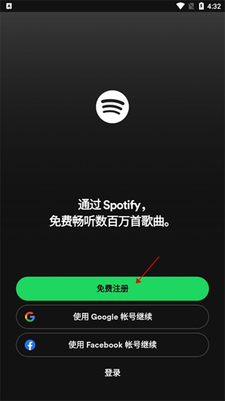 1、在本站下载并打开声破天Spotify,点击免费注册;