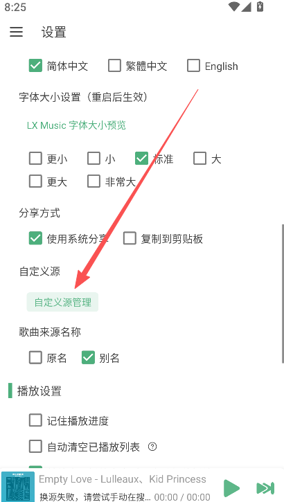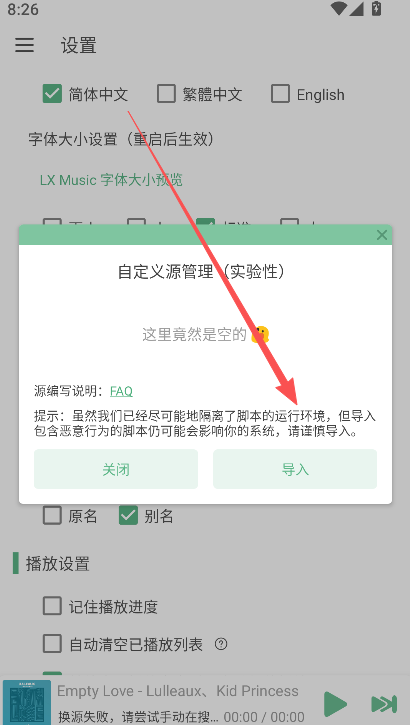 检查导入步骤是否正确:进入车机版洛雪音乐的「设置」→「音乐来源」→「自定义源管理」,选择「本地导入」或「在线导入」,确保选中正确的音源文件或URL。