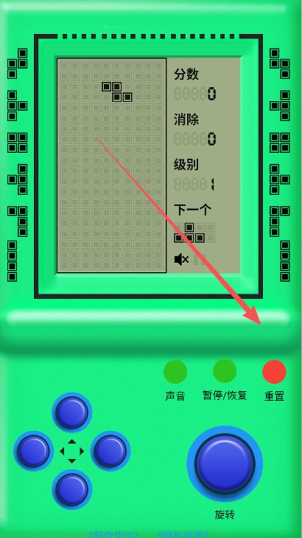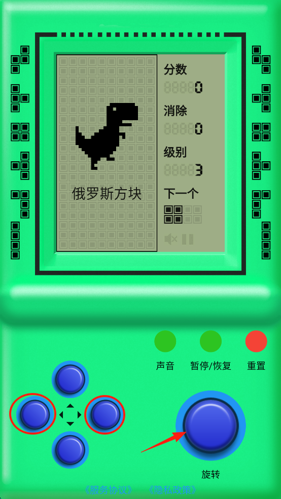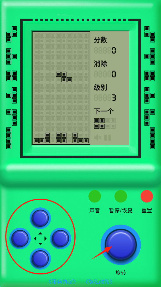 2、左侧的方向键,点击“下键”加快下落速度,“左右键”控制方向,“上键”瞬间下落,右侧的“旋转键”控制方块旋转。