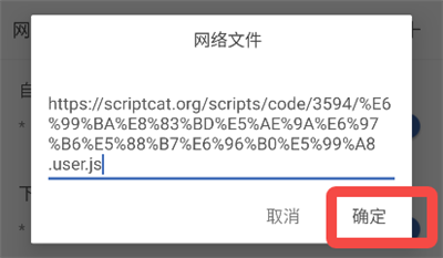 4、将脚本的网址复制进去(注意是以【.user.js】结尾的),点击【确定】。