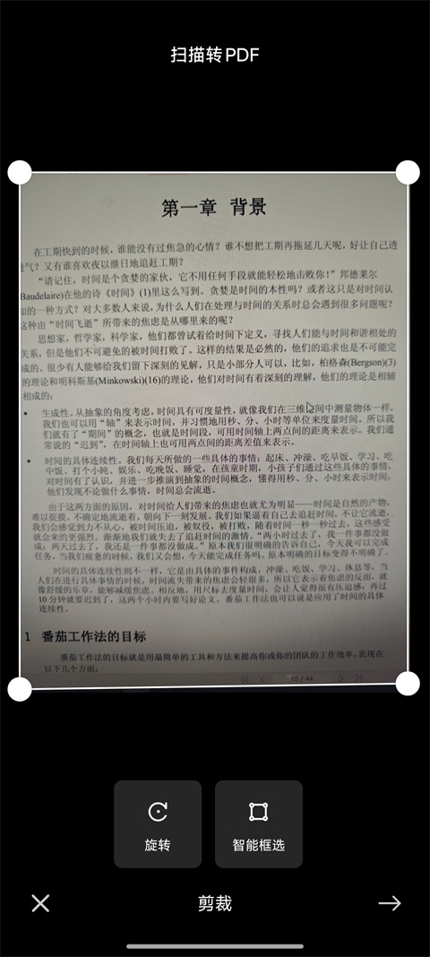 2、点击“扫描转PDF”,对准文件拍摄,支持智能框选或手动调整识别区域。