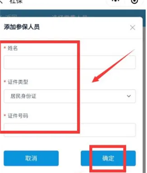 3、选择缴费人员,点击“添加人员”。添加参保人员,输入姓名和证件号码,点击“确定”。添加之后,点击“缴费”完成支付即可。
