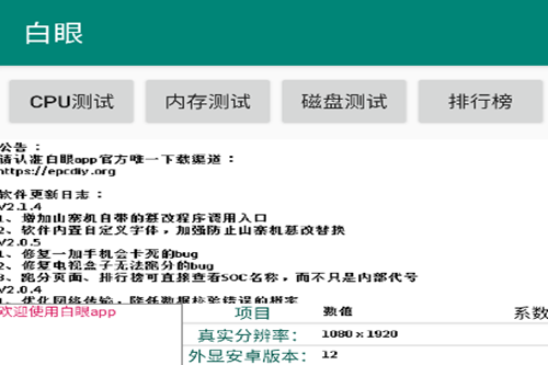 白眼APP是知名B站UP主epcdiy开发的手机检测神器,设计简洁无广告且免费,可全方位评估手机性能,精准判定内存磁盘容量,还能与全球用户分享对比。能检测CPU、内存、磁盘与屏幕,无需ROOT或ADB权限,需要的赶紧来本网站下载!
