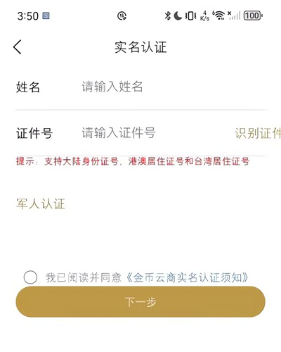 2、用户填写好自己的姓名以及证件号,或者点击"识别证件"通过扫描身份证导入个人信息,还支持军人认证;