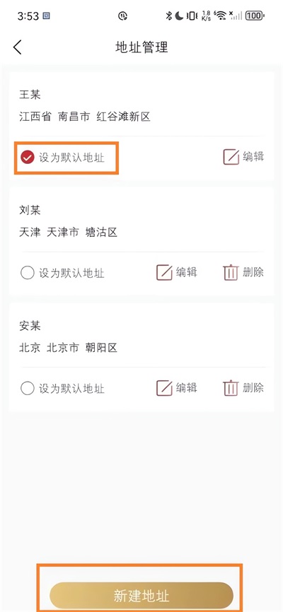 4、"地址管理"这可对地址进行编辑或者删除,还可勾选将其设为默认地址,若用户需新增。点击最下方"新增地址"即可。