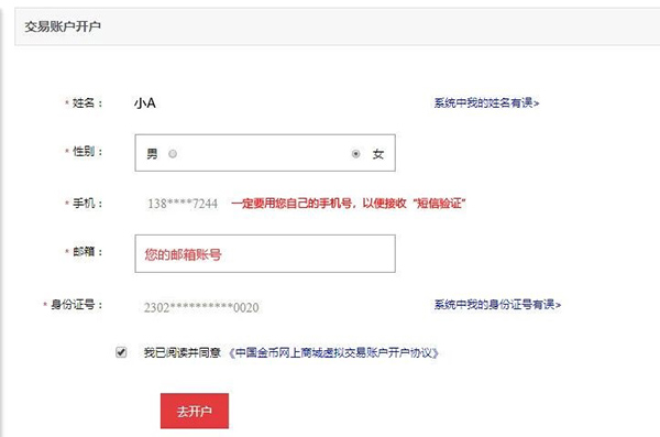 第二步:选择性别,确认手机号是否正确(手机号有误将收不到验证码),填写您的邮箱号,勾选“我已阅读并同意《中国金币网上商城虚拟交易账户开户协议》”,点击“去开户”