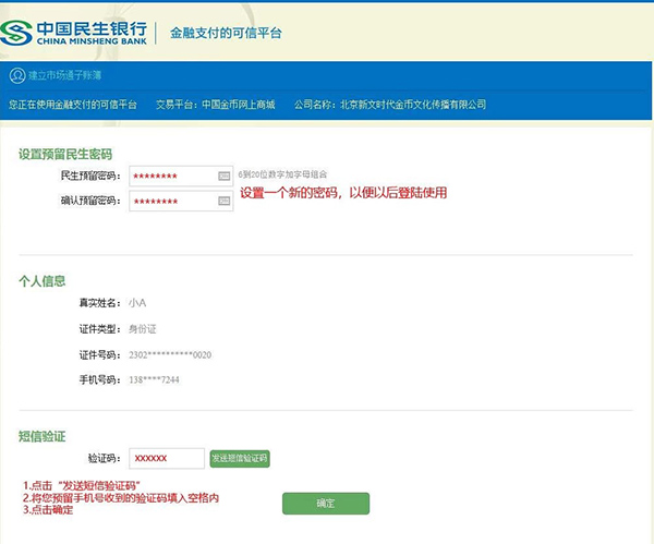 第三步:页面跳转到中国民生银行平台,没有民生卡的会员不要慌!设置一个“预留民生密码”并记住它,后面需要您填写这个密码。点击发送短信验证码,并填写在空格内,点击“确定”完成开户。
