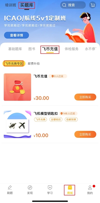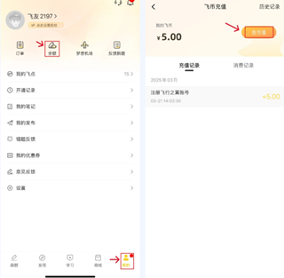 点击底部商城,找到飞币充值,点击相应额度完成飞币充值