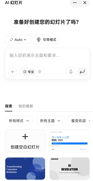 1、在注册登录软件后可以在聊天框中直接输入制作PPT的需求,也可以点击下方AI幻灯片进入专业PPT模式。