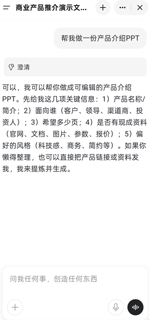 3、接着在聊天框中输入我们的需求,比如做一份产品介绍PPT。
