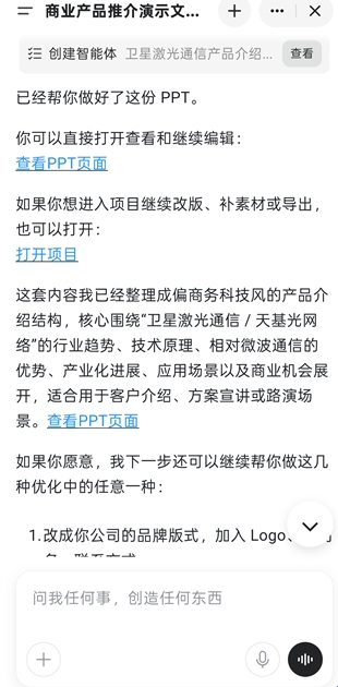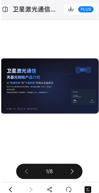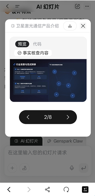 5、比如我发送了一段卫星激光通信产品的资料,等待一段时间后Genspark AI会生成一份PPT可以点击进入查看。