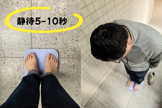 2、规范测量赤脚平稳站在体脂秤电极片上,保持身体直立、双脚分开与肩同宽,不要晃动,静待5-10秒即可完成测量;