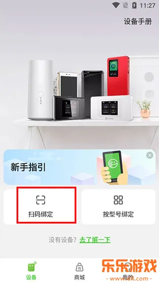 2、进入设备页面,选择“扫码绑定”扫描机身背面二维码或开机扫描屏上二维码对设备进行绑定。