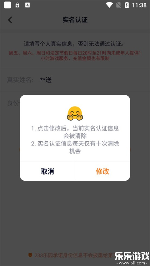 4、注意的是:点击修改后,当前实名认证信息会被清除,实名认证信息每天仅有十次清除机会。