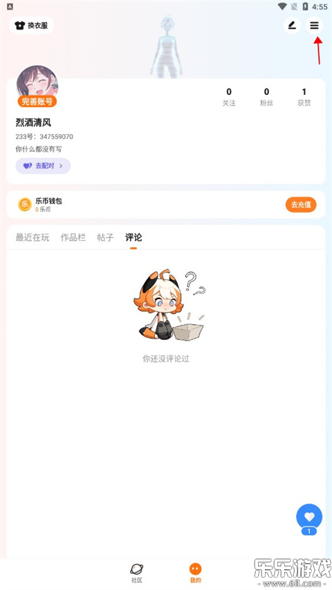 1、进入233乐园官方最新版,点击我的,点击右上方按钮所指地方。