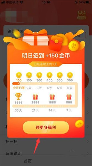 2、在弹出签到小框里点击领更多福利;