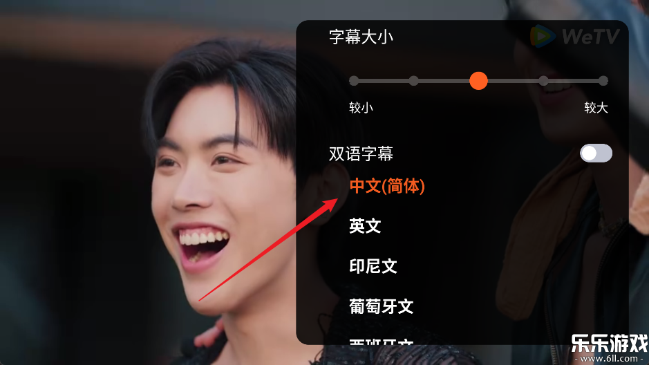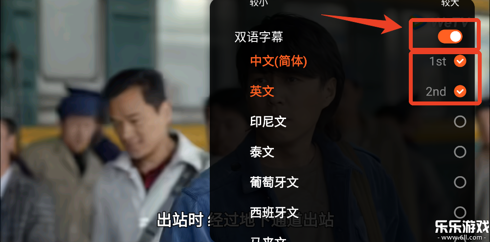 2、点击这里打开这个【双语字幕】,选择1st字幕和2st字幕,1st会显示在上,2st会显示在下。除了英文,还有印尼文、日文、韩文等语言。