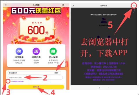 1、先选择你的意向加盟城市,输入手机号,勾选同意相关协议,点击“立即注册”。接着获取短信验证码,输入完成后,就注册成功了。最后会跳转到花小猪司机端下载页面,点击右上角三个点⋯选择在浏览器中打开,下载花小猪司机端APP。