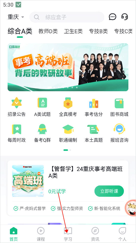 1、打开事考帮app,来到用户首页,点击下方的“学习”选项