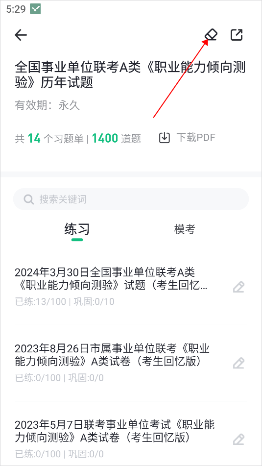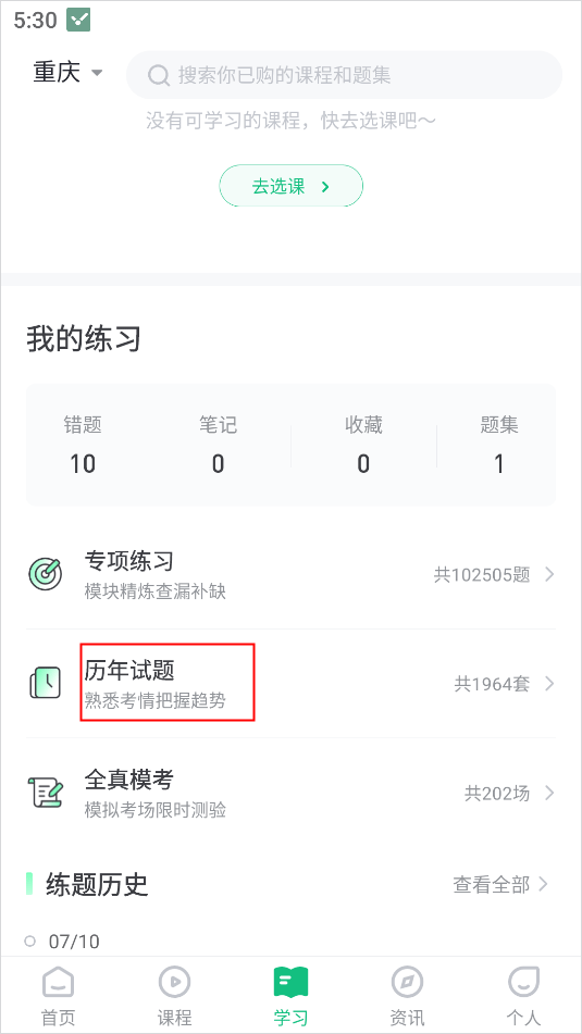2、进入到学习页面,点击我的练习下方的“历年试题”选项