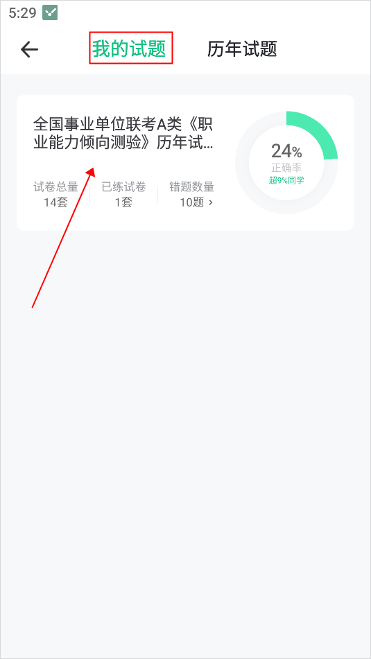 3、之后再点击上方的“我的试题”选项,点击做过的试题进入