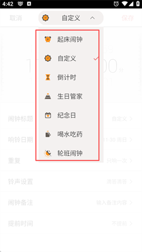 2、在弹出的类型选择框中,挑选闹钟类型如【起床闹钟、倒计时】等