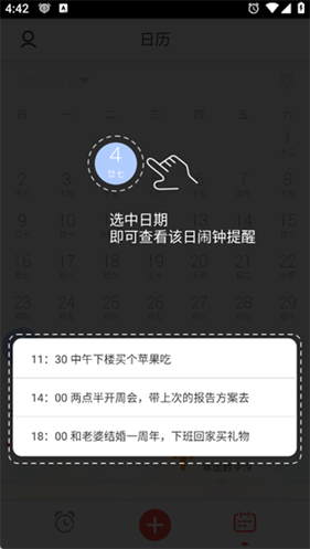 5、此外,点击底部右侧的【日历】图标,选中对应日期,即可查看当天的闹钟/日程提醒