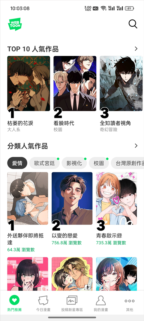 webtoon台版是专为台湾用户打造的漫画阅读平台,该平台汇聚了全球热门漫画作品,涵盖日韩漫画、欧美经典及国产原创,题材丰富多样,包括爱情、奇幻、悬疑、热血、治愈等,满足不同用户的阅读偏好。软件界面简洁友好,支持繁体中文,操作流畅,提供高清流畅的阅读体验,让用户随时随地享受漫画乐趣,所有漫画均经过正版授权,确保品质与版权合法性,支持横向滑动、纵向滚动等多种阅读模式,用户可根据习惯选择,每日定期更新大量优质漫画内容,包括独家连载作品和原创精品推荐,提供简体中文、繁体中文、英文、韩文等多种语言,全球用户均可无障碍阅读。