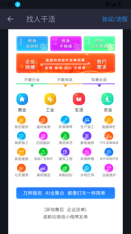2. 不竞价排名,资源合理公平分配,需求就近AI匹配,师傅企业做自己的口碑品牌。