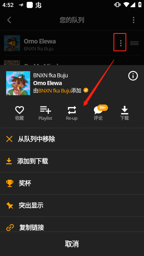 打开播放列表,选择目标音乐打开更多选项,在下图所示位置可切换播放模式为“单曲循环”