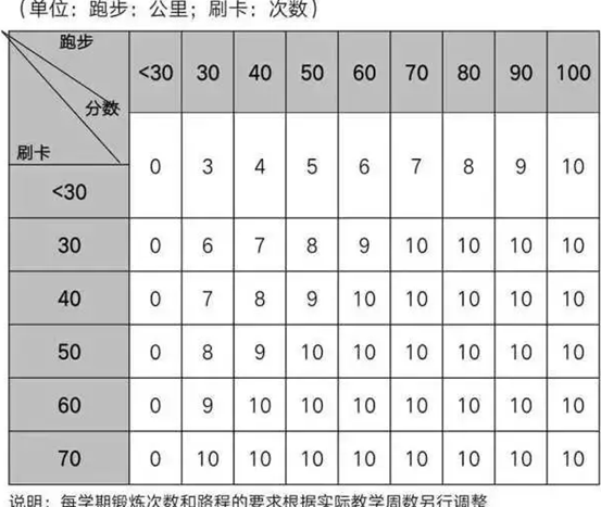 每学期结束前,依据学生累积跑步路程和刷卡次数核算课外体育锻炼成绩,且按10%计入体育课总成绩