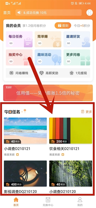 进入爱调研首页,找到[今日任务]即问卷列表,即可参与。成功完成一份问卷,能获得40-2000积分不等的积分,即使因为不符合条件或者配额满而被终止,也能获得10积分哦。