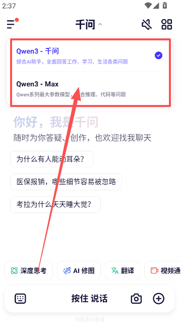2、默认模型是Qwen3-千问,如需切换可点击Qwen3-Max进行切换。