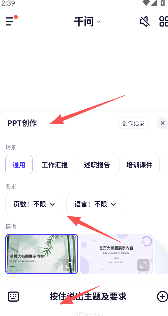 2、根据使用途径,选择PPT创作的模板、场景以及要求等,如果有具体可在下方通过语音或是文字输出的方式进行编辑添加生成的。
