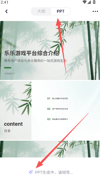 5、PPT生成需要一定时间,篇幅会根据你所设置的模板条件来。