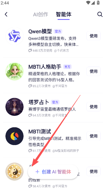 1、切换AI创作页到智能体,点击下方创建AI智能体。