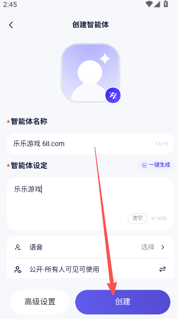 2、设置智能体头像、智能体名称、智能体的设定选择添加语言和展示不分完成创建。