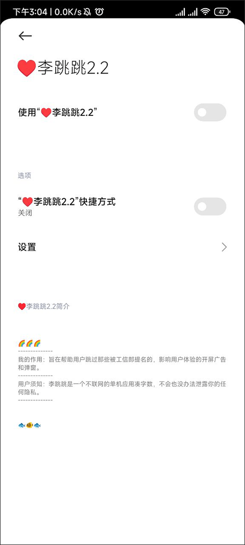 李跳跳派大星是一款名称俏皮、体积小巧、功能专业的开屏广告跳过工具,彻底解决开屏广告困扰,适配广、操作易、安全稳定,是提升手机使用体验的必备实用软件。