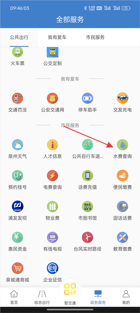 2、下滑页面,找到并进入【水费查询】功能;