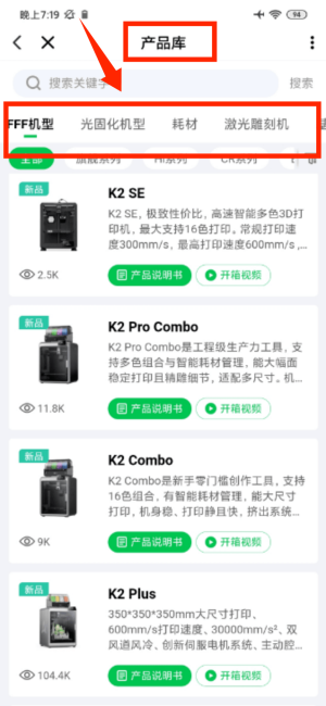 3、在产品库页面通过分类筛选,查看3D打印产品信息。