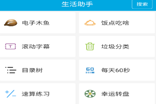 主要有:新华字典、历史上的今天、唐诗三百首、三字经、百家姓、成语查询、谜语大全、歇后语、名人语录、花语大全、法律法规、在线翻译等学习工具。